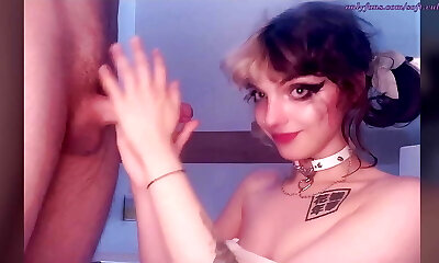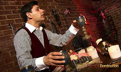 Chesty Goth Mistress is milking her manservant dry of his semen